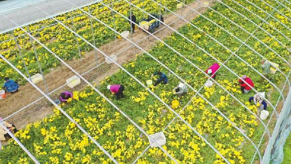近日,新河县仁让里乡后沙洼村的金丝皇菊喜获丰收,花农趁晴好天气采收、整理、烘干金丝皇菊。