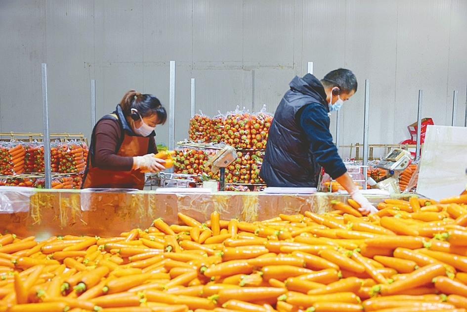 近日,在宁晋县建农种植专业合作社,工人们正在将加工好的胡萝卜进行装袋。
