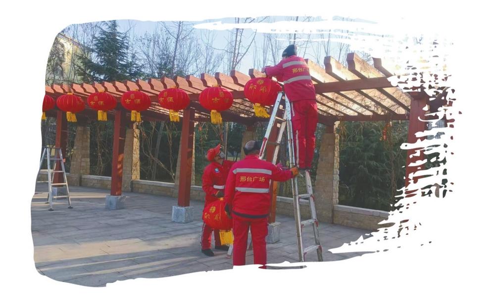 在高铁广场上,身着红色工装的广场工人正忙着组装灯笼、穿线、调整位置,将灯笼悬挂在广场出入口、灯杆、道路两侧等显要位置,打造错落有致、虚实结合的新春景观。(邢台新闻传媒中心记者
