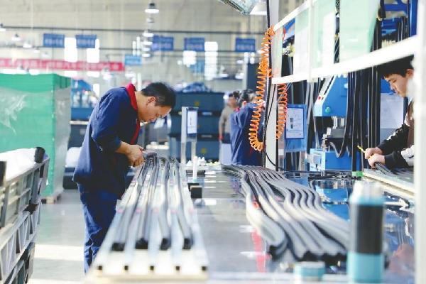 工人在加工汽车密封条。魏宝爱、王琳摄