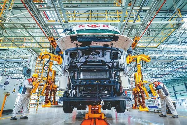 3月13日,信都经济开发区河北长征汽车制造有限公司的整装车间内,工人正在装配超级混动智能重卡车辆。