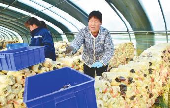 日前,南和区河郭镇刁庄村村民正在大棚内采摘蘑菇。