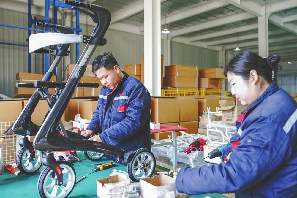 近日,位于平乡县的邢台金天儿童用品有限公司生产车间,工人在组装童车产品。