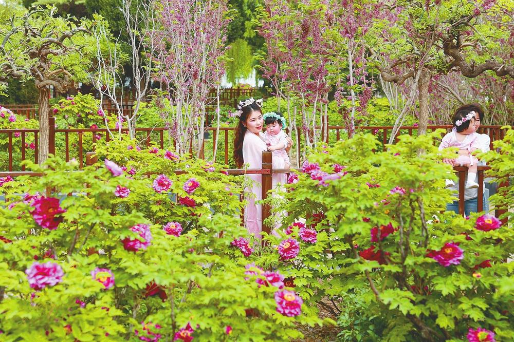 4月16日,游客身穿汉服在柏乡县汉牡丹园内游览。