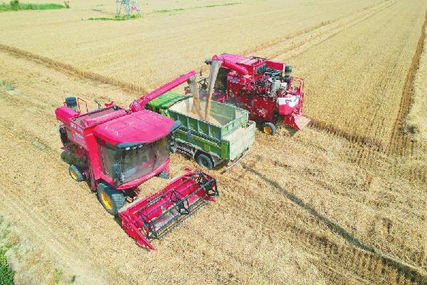 近日,在巨鹿县堤村乡贾庄村,当地村民正抢抓晴好天气,有序开展小麦收割工作,确保夏粮颗粒归仓。 韩文洲、张博摄