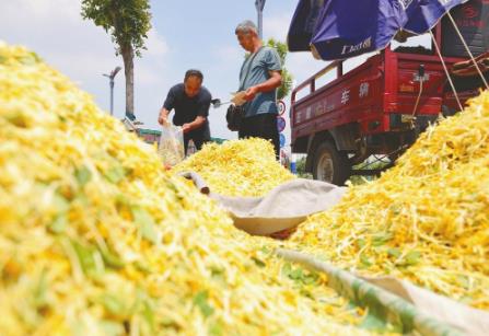 近日,一名客商在广宗县广宗镇收购金银花。