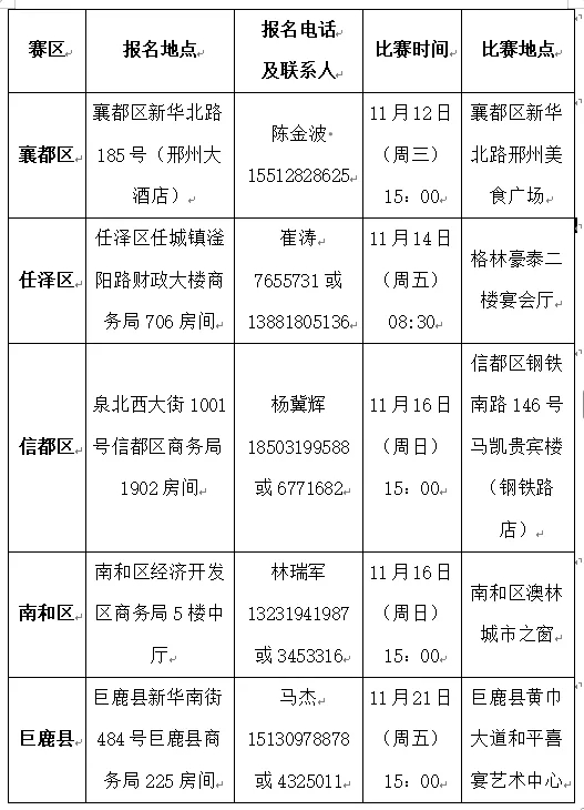 目前,五大赛区报名通道已同步开启,有意向的烹饪爱好者可前往就近赛区指定地点报名,报名详情可咨询各赛区商务局。各赛区具体报名及比赛信息如下: