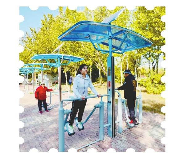 穿越甬道,体育惠民工程健身器材区,一排崭新的智能健身器材格外醒目。