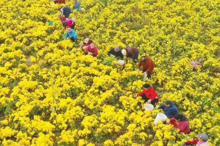 近日,村民在新河县新河镇邢家庄村田间采摘金丝皇菊。