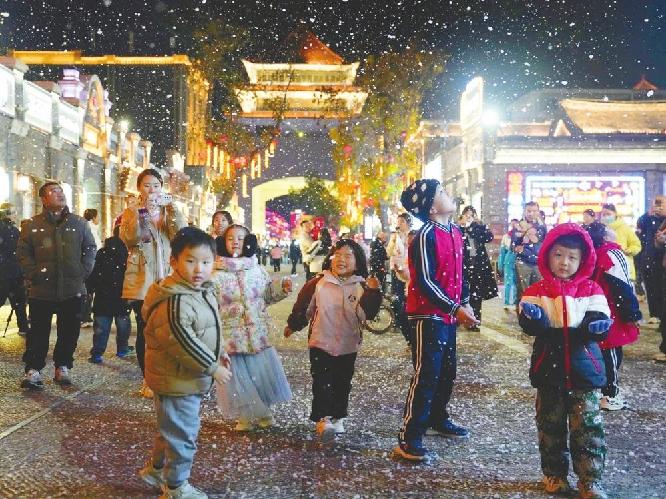 11月21日,好南关街区新上线的人工造雪景观区吸引了众多游客前来赏“雪”打卡。