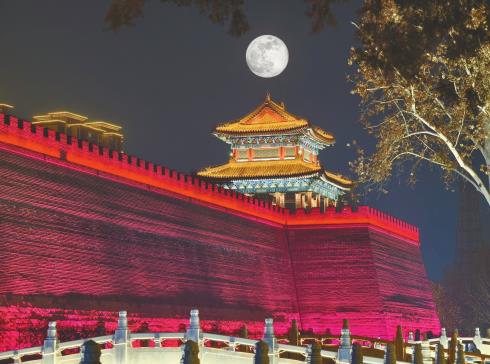 1月3日晚,皎洁月光洒落角楼广场,光影流转间古韵悠长,焕新景致更显静谧雅致。