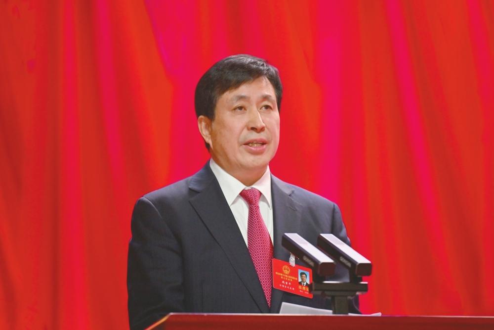 刘文萍作政府工作报告。本报记者 郝德明摄