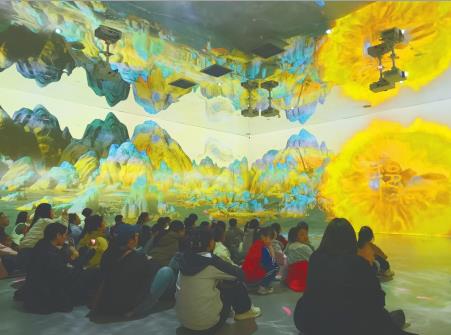 拾级而上,二楼体验厅的泉脉印象展厅瞬间吸引了所有亲子的目光。唯美的光影画卷徐徐展开,百泉群涌、流水潺潺的邢襄胜景在眼前浮现,光影流转间,古今交融的泉韵之美让大家深深沉浸。小记者们趴在地面上,细细观赏画卷中的每一处细节,在视觉与文化的双重盛宴中,共同触摸家乡的水脉根脉。