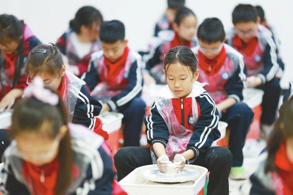 近日,内丘县以邢窑博物馆、邢窑遗址博物馆和邢瓷文化体验馆为核心,构建“邢窑文化研学矩阵”,通过近距离观赏藏品、亲手制作体验拉坯、模拟挖掘寻宝等模式,吸引大批中小学生参观学习。图为小学生在内丘县邢窑博物馆体验拉坯。(韩文洲 刘继东 摄)