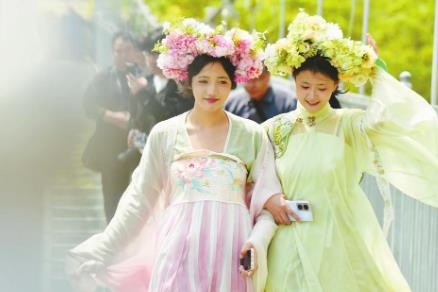 走进景区,玫瑰花瀑布、绿野仙踪森系秘境、灵验姻缘树等打卡点前,游客们纷纷驻足拍照。在国风簪花体验区,几位年轻女士正在工作人员的帮助下佩戴簪花。“今天特意和朋友一起来,现场免费体验簪花,还有简易妆造,感觉特别贴心。”来自市区的张女士笑着说。
